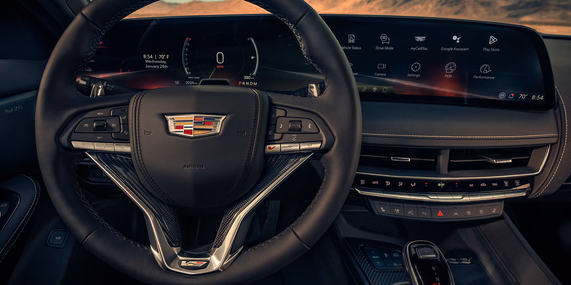 La incorporación de una pantalla digital de 33 pulgadas moderniza y simplifica el interior del Cadillac sin afectar su usabilidad general. Los controles de climatización y asistencia al conductor son fáciles de alcanzar y están claramente identificados. También nos gusta que la pantalla táctil se pueda operar mediante un dial, para que puedas elegir cómo quieres interactuar con el sistema.