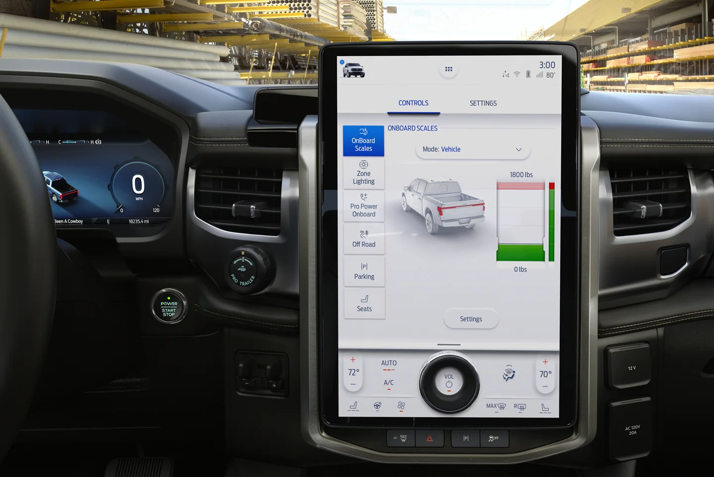 Utiliza la tecnología más nueva en el automóvil de Ford para un gran éxito. Nos gusta la gran pantalla táctil central de 15.5 pulgadas que es compatible con controles físicos, como una perilla de volumen. La integración de teléfonos inteligentes de Apple CarPlay y Android está presente y también inalámbrica (aunque aún puede conectarse a través del cable USB).El sistema de navegación a bordo de Ford es receptivo y diseñado limpiamente, pero no es demasiado minimalista como algunos sistemas de competidores. El ajuste del modelo platino, que es lo que probamos, incluye un excelente sistema de sonido Bang & Olufsen de 18 bocinas que crea un entorno de excelente sonido. Nuestro camión de prueba también tenía un conjunto integral de ayudas de conductor avanzadas, incluida la Blue Cruise de Ford, una forma más avanzada de control de crucero adaptativo, centrado de carril, advertencia de punto ciego y cámaras de 360 grados. Si bien Blue Cruise no está disponible para usar en cada carretera, el control de crucero adaptativo regular del Lightning resultó suave y constante y se mantuvo al día con el flujo de tráfico a todas las velocidades en nuestras pruebas. Y gracias a la multitud de cámaras de alta definición del Lightning, es un camión fácil de maniobrar en espacios ajustados. El equipo estándar en el platino es una gran cantidad de características relacionadas con el remolque agrupadas en el paquete de tecnología de remolque. Estas características incluyen una escala incorporada para ayudar a equilibrar el peso del remolque, la guía de inversión del remolque y un controlador de freno de remolque integrado, presenta comunes a la mayoría de los paquetes de remolque en pastillas con gas y diesel.