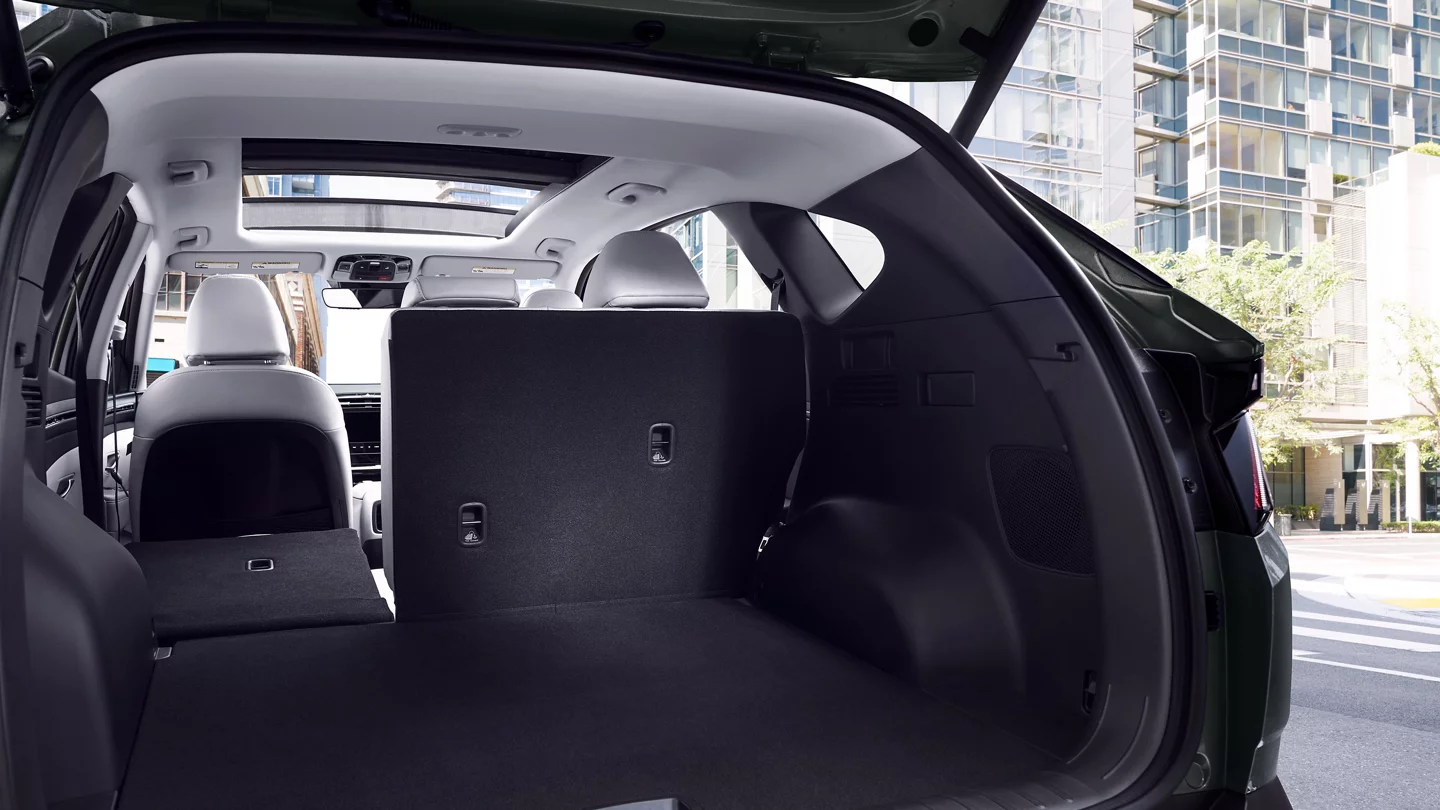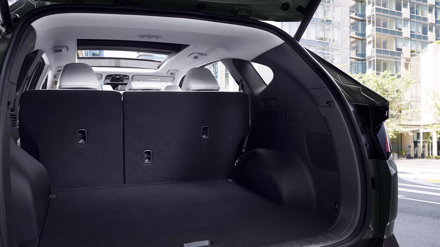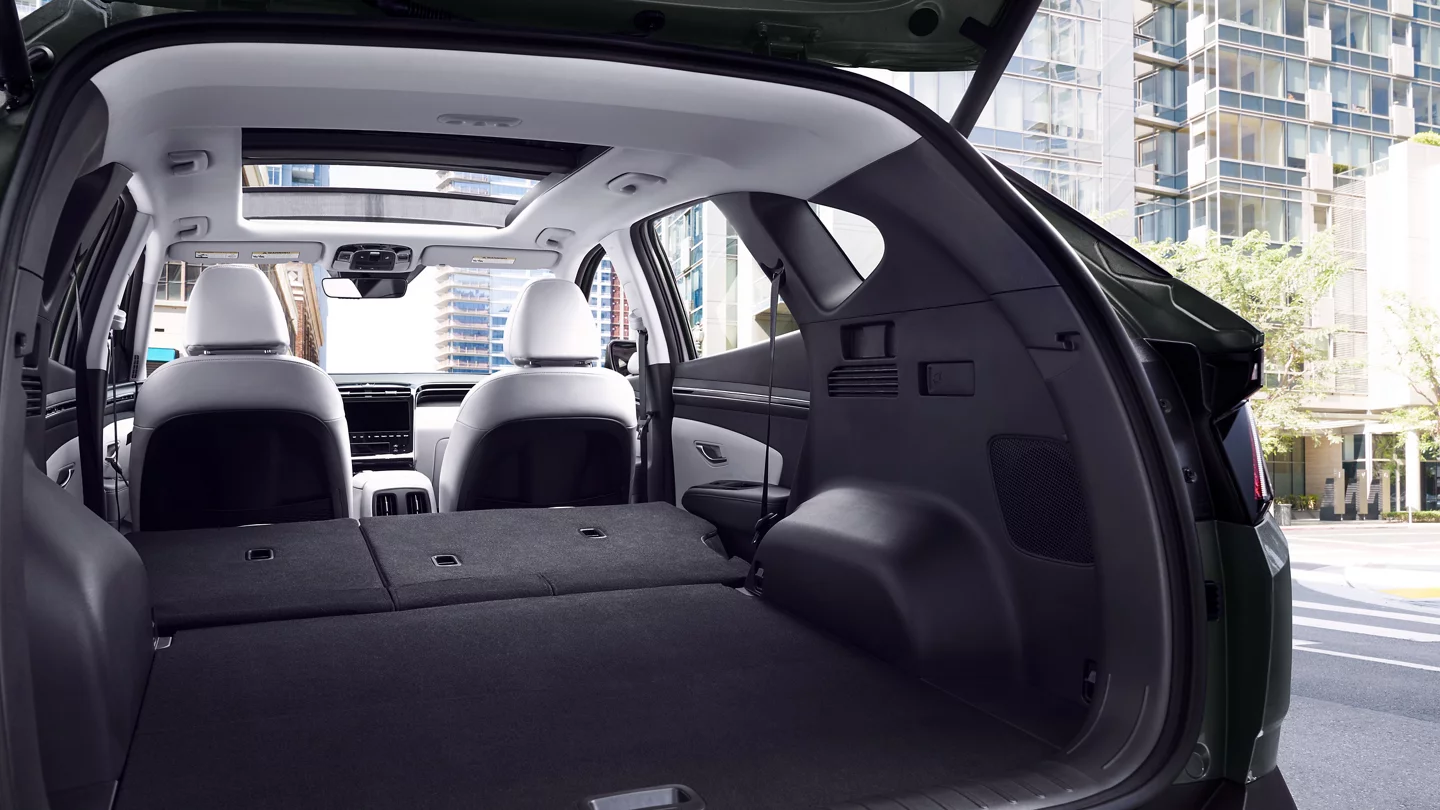 El espacio del baúl es espacioso en el Tucson Hybrid, con una capacidad de carga de 38,7 pies cúbicos detrás de la segunda fila de asientos. Este es el mejor de los SUV híbridos, y también tiene una altura de elevación baja y un piso plano. Hay palancas montadas en la pared que plegarán la segunda fila de asientos hasta dejarla plana.