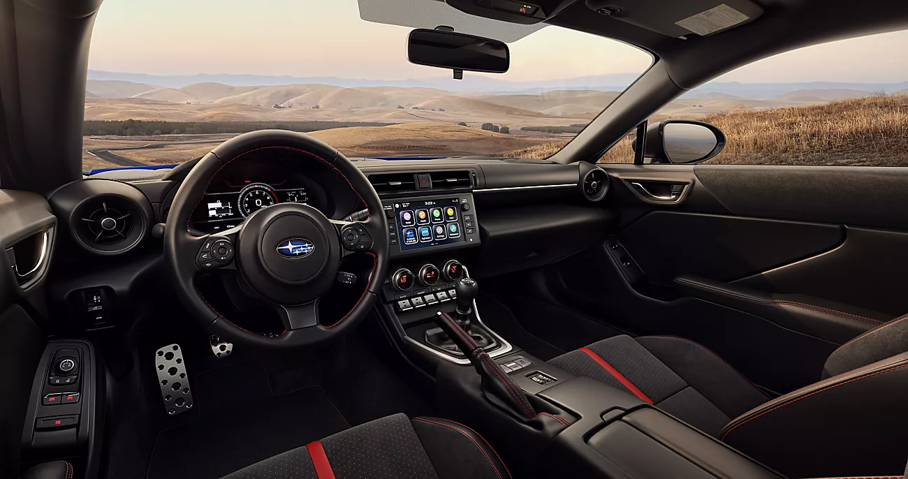 Básico, sencillo y fácil de usar, el interior del BRZ permite al conductor concentrarse en la conducción. Las dimensiones compactas del BRZ no le brindan mucho espacio interior, pero los pasajeros delanteros lo encontrarán más que cómodo, especialmente si están en el lado más alto. Los conductores más altos también apreciarán el espacio adicional y el margen de ajuste, especialmente en comparación con el Miata, que es mucho más estrecho. Los asientos traseros, sin embargo, se utilizan mejor como espacio de almacenamiento interior que para los pasajeros. El tablero bajo del BRZ es posible gracias a una pantalla táctil de infoentretenimiento bien integrada montada fuera del camino para mejorar la visibilidad hacia adelante. El motor de bajo perfil del Subaru también le da al BRZ una línea de capó baja, lo que mejora aún más la visibilidad en carreteras secundarias y pistas de carreras. Tenga en cuenta que la altura de manejo baja y las puertas largas del BRZ pueden dificultar un poco la entrada y salida.